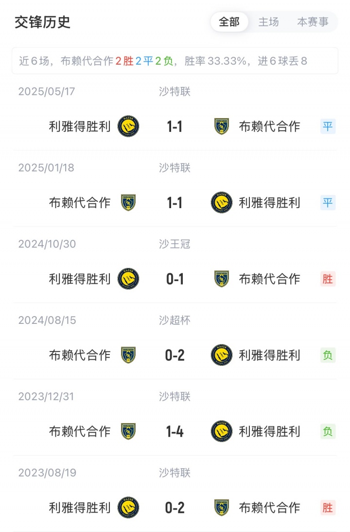 利雅得胜利上赛季排名沙特联第三,布赖代合作排名第八,近三场直接对接胜利2平1负。