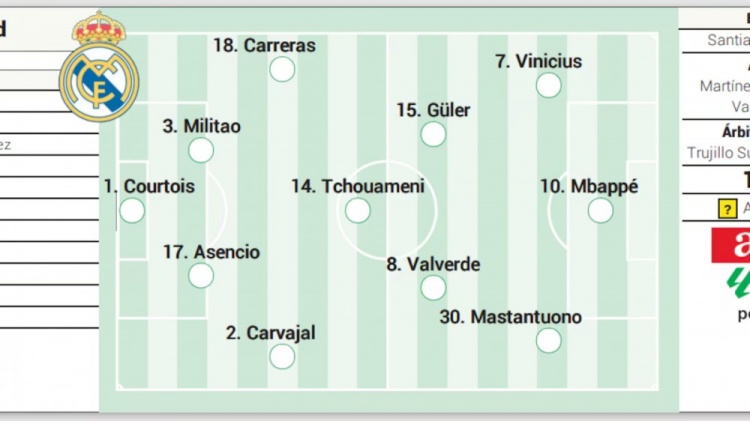 阿隆索最初计划仅调整锋线,维尼修斯将重回首发。同时将迎来贝林厄姆和卡马文加两大备受期待的变数。虽然两人都已进入对阵马赛的大名单,但教练认为当时并非合适的登场时机,而本场计划在下半场逐步让他们替补登场。