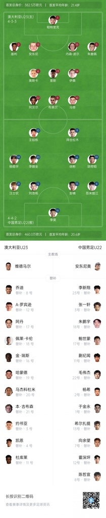 澳大利亚U23首发:1-帕特里克-比奇、2-基利-亚当森、5-朱塞佩-博瓦利纳、13-安东尼-潘塔佐普洛斯、6-奥斯卡-普里斯特曼、14-伊桑-阿拉吉奇、23-里斯-博日诺夫斯基、9-纳撒内尔-布莱尔、10-马修-格里马尔迪、15-内森-波尔、22-埃布尔-瓦拉蒂